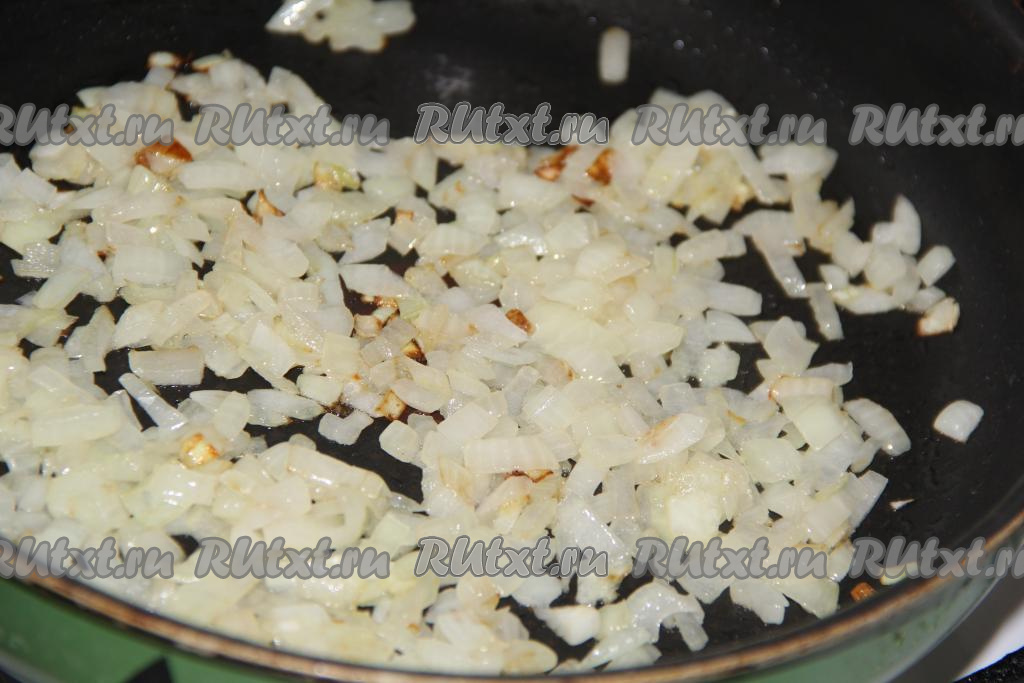 На отдельной сковороде очищенный и мелко нарезанный лук обжарить на растительном масле до золотистого цвета, помешивая.