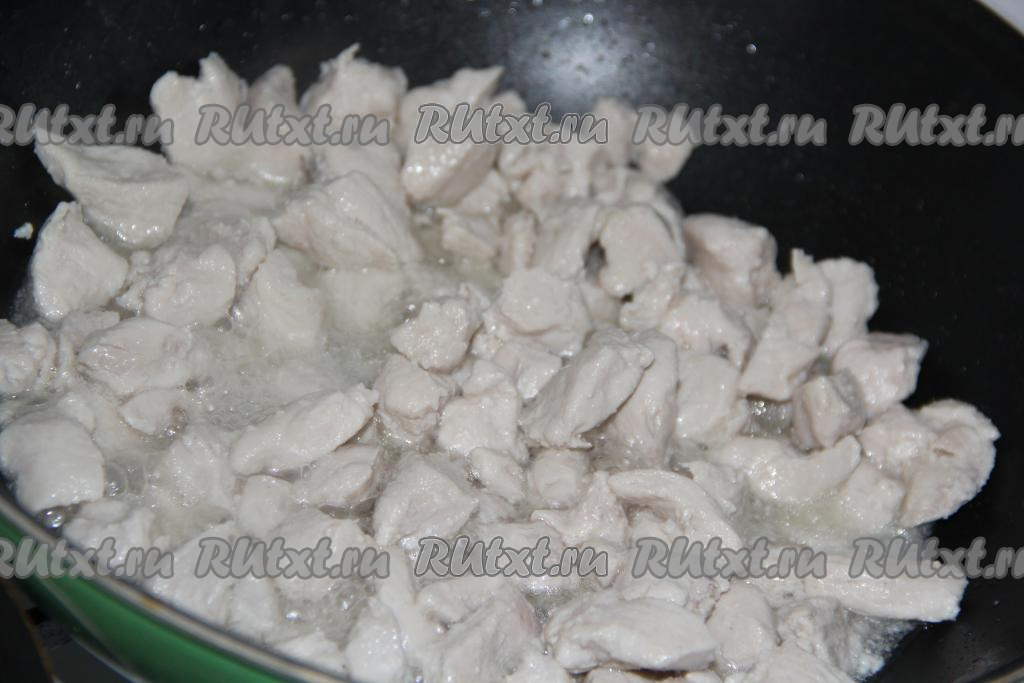Обжарить куриное мясо на среднем огне в течение 15 минут, периодически перемешивая кусочки.