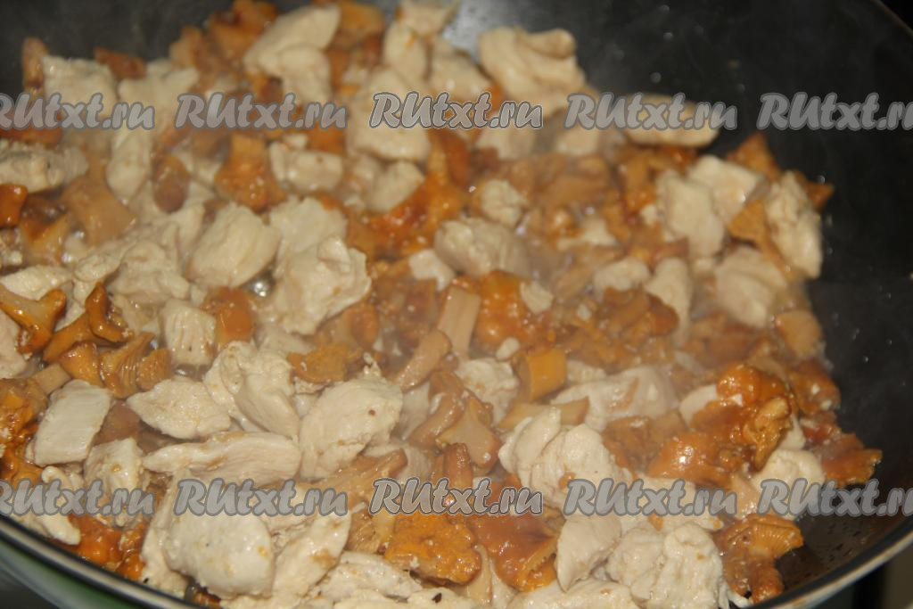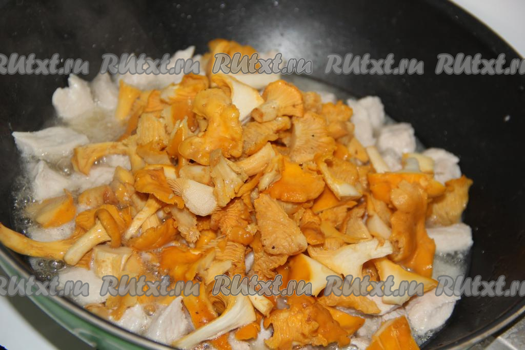 Лисички промыть под проточной водой. Крупные грибы я нарезала, а мелкие оставила целыми. Когда куриное филе обжарится, выложить лисички.
