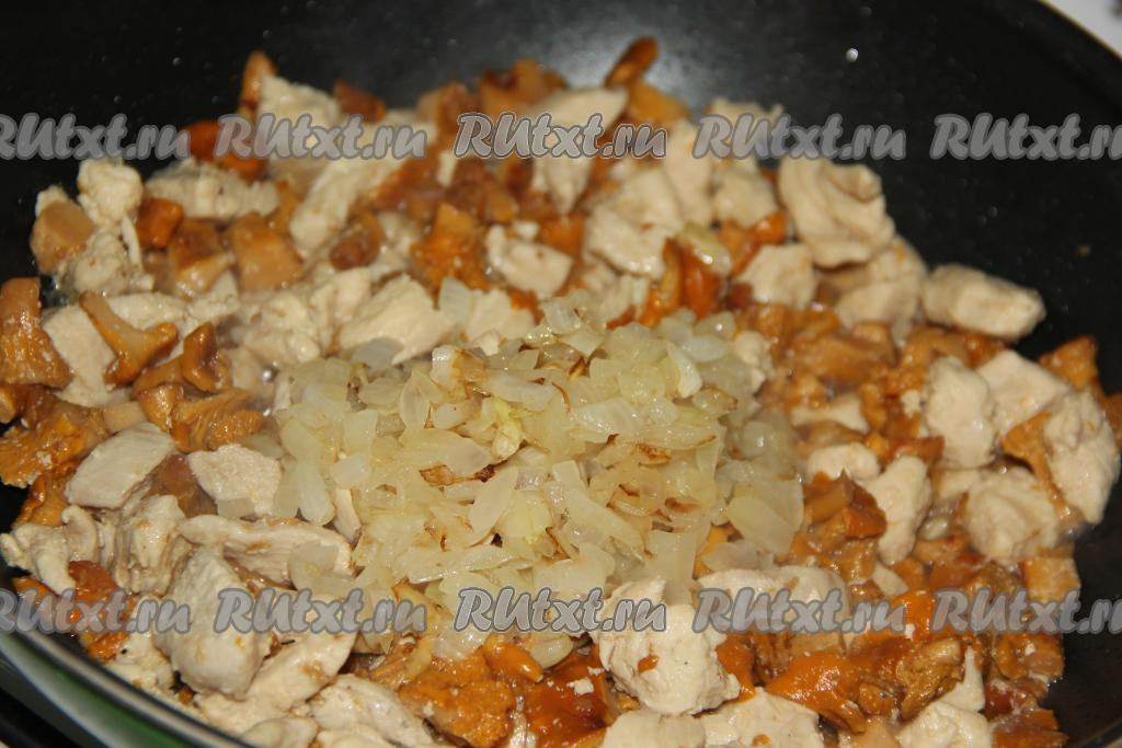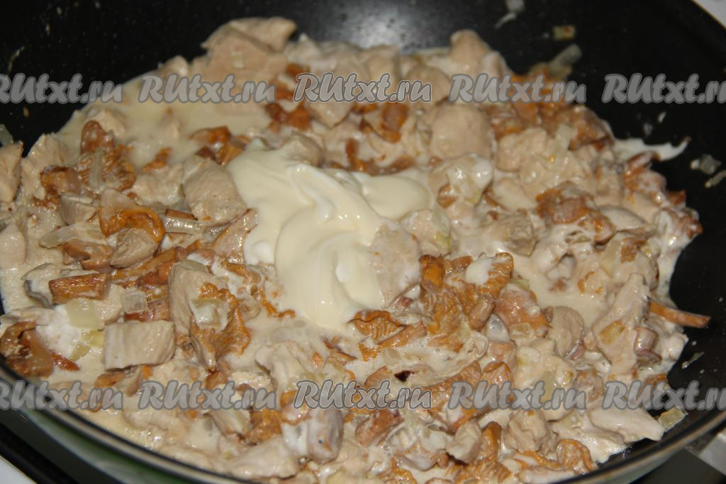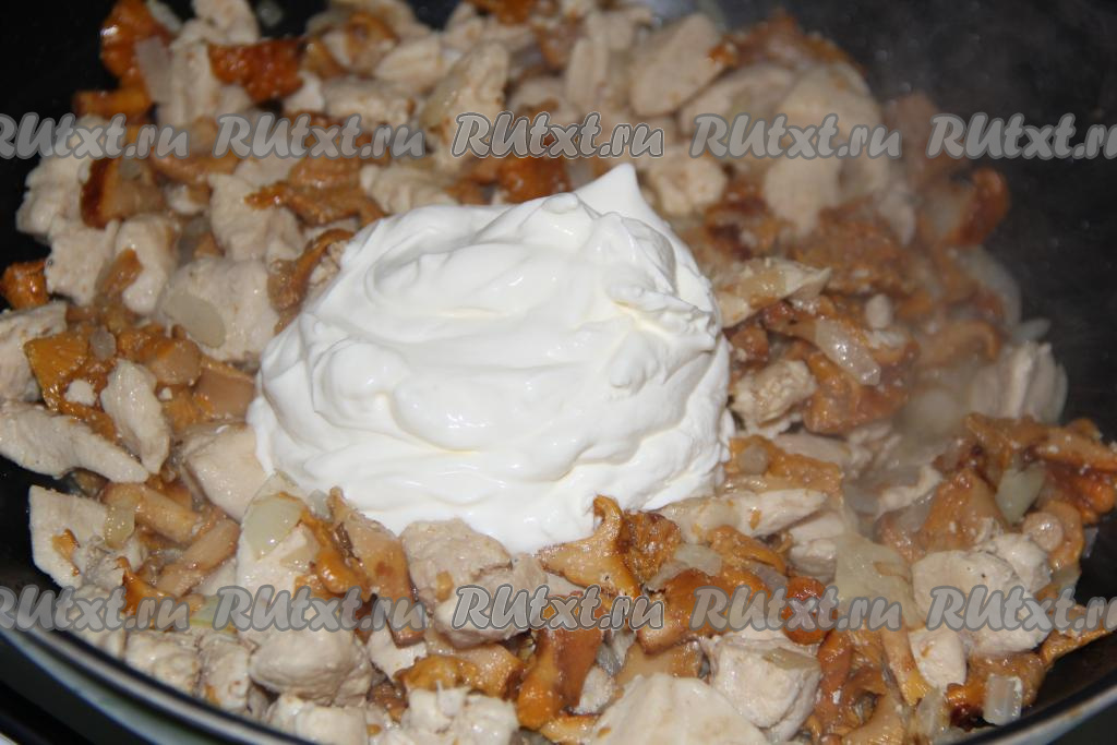 Перемешать куриное филе с луком и лисичками, затем добавить сметану и еще раз тщательно перемешать.