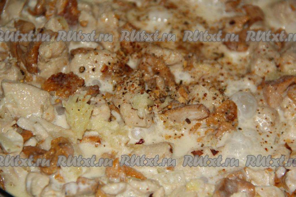 Тушить куриное филе с лисичками 15 минут на небольшом огне, иногда помешивая.