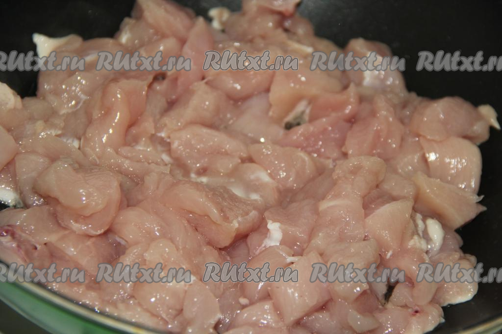 В сковороду с высокими бортиками влить немного растительного масла и выложить куриное филе, нарезанное на кусочки среднего размера.