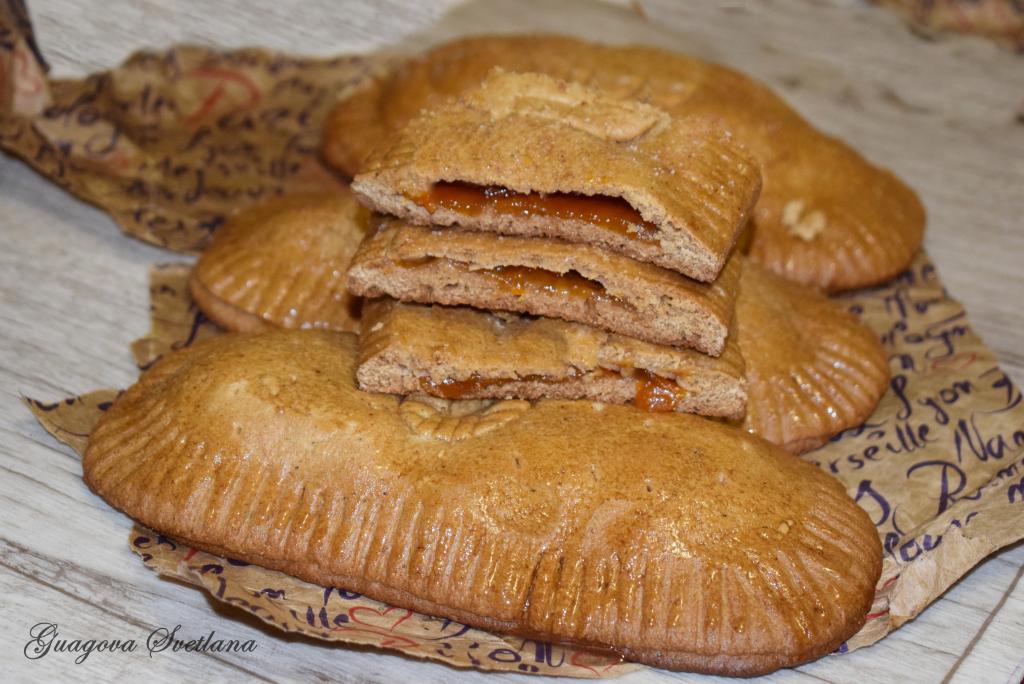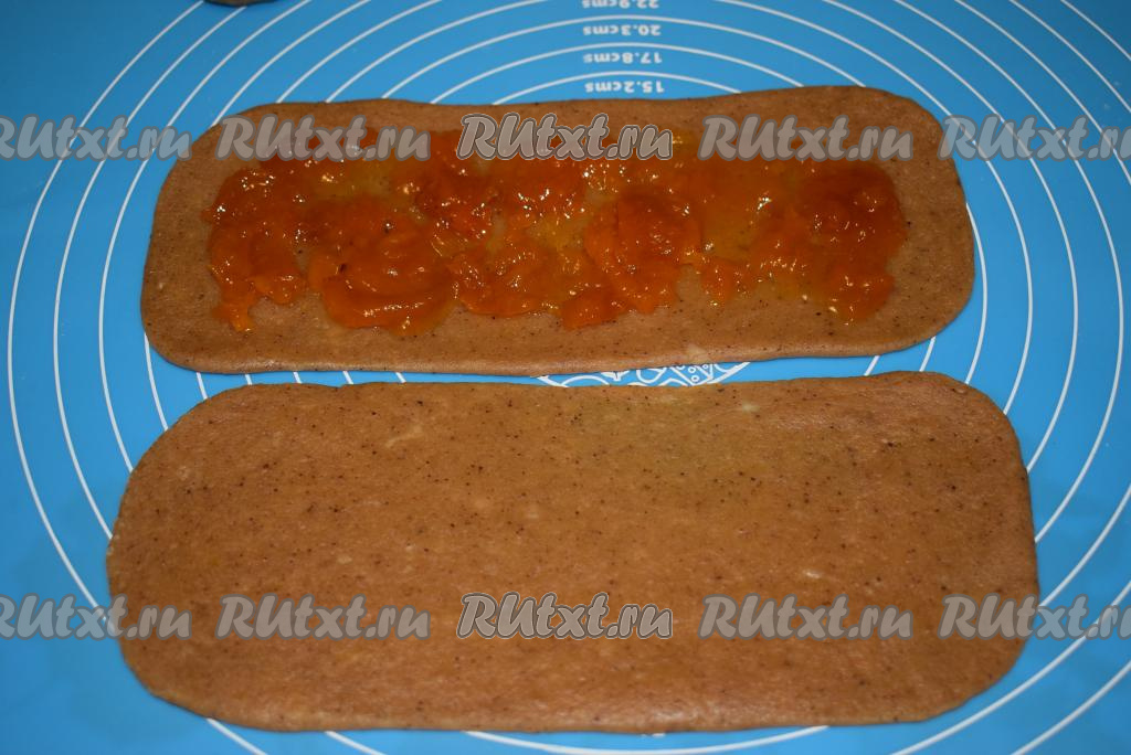 Для приготовления одного тульского пряника берём два раскатанных прямоугольника. На один намазываем 2 столовые ложки варенья или повидла (у меня абрикосовое варенье).