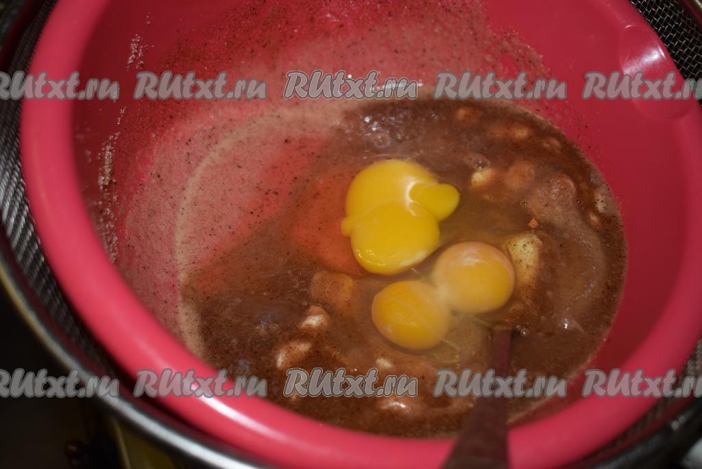 Когда масляно-медовая смесь слегка растворится на водяной бане, добавим яйца.