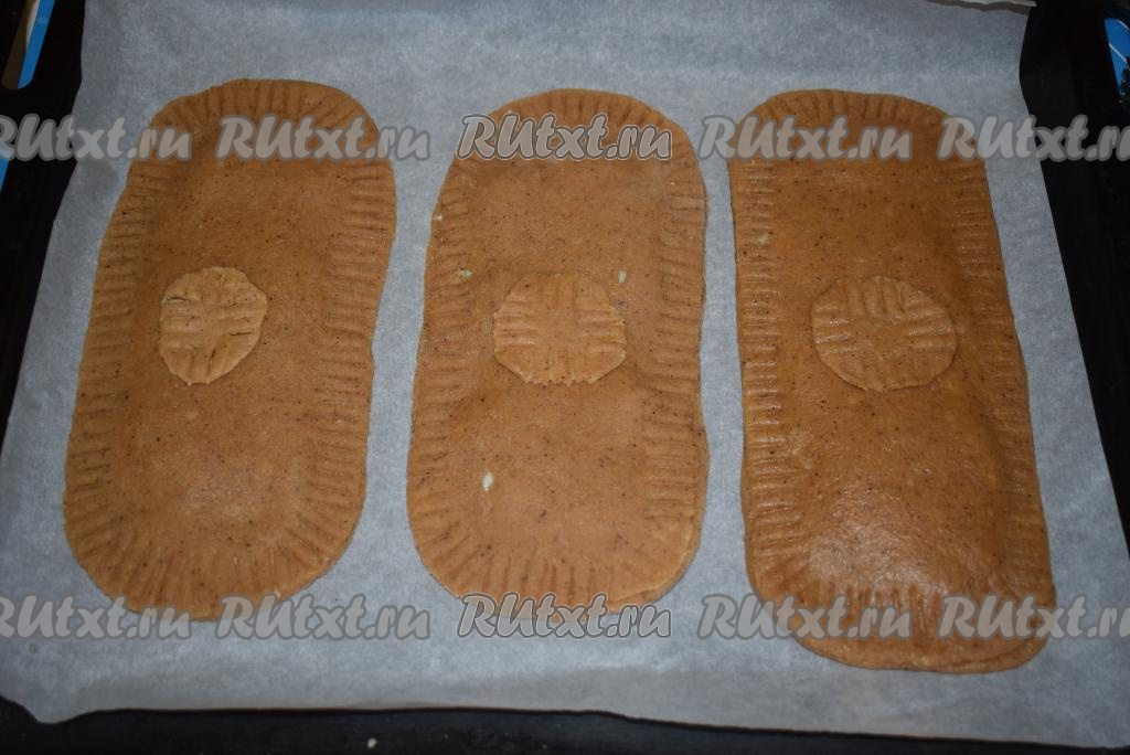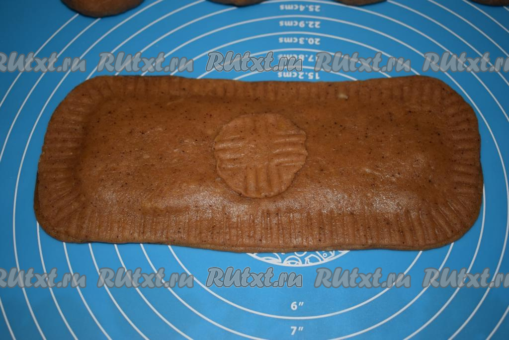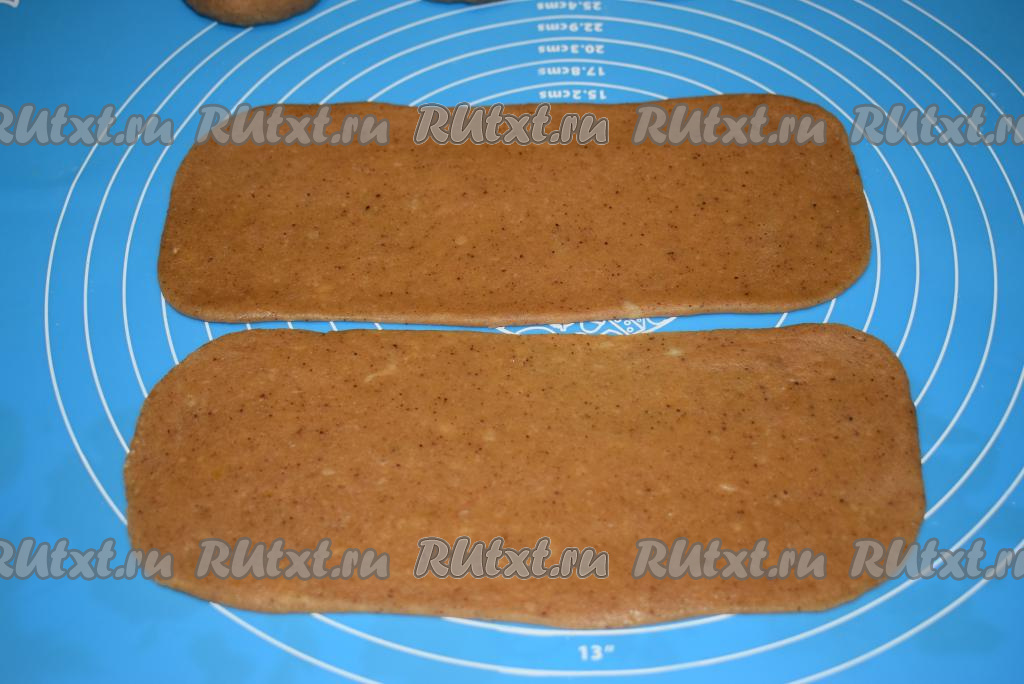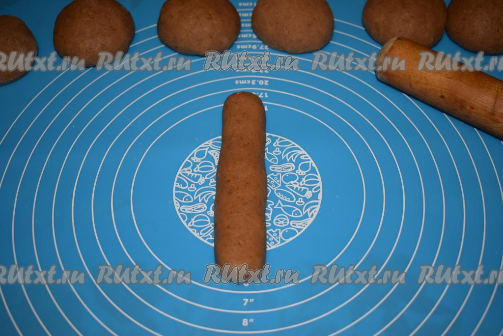 На силиконовом коврике или на столе, припыленном мукой, раскатываем скалкой колбаски в прямоугольники, примерно, равного размера. Каждый пряник будет в дальнейшем состоять из двух прямоугольников. Тесто надо раскатывать не тоньше 0,5 см, иначе оно начнет при выпечке подниматься пузырями.