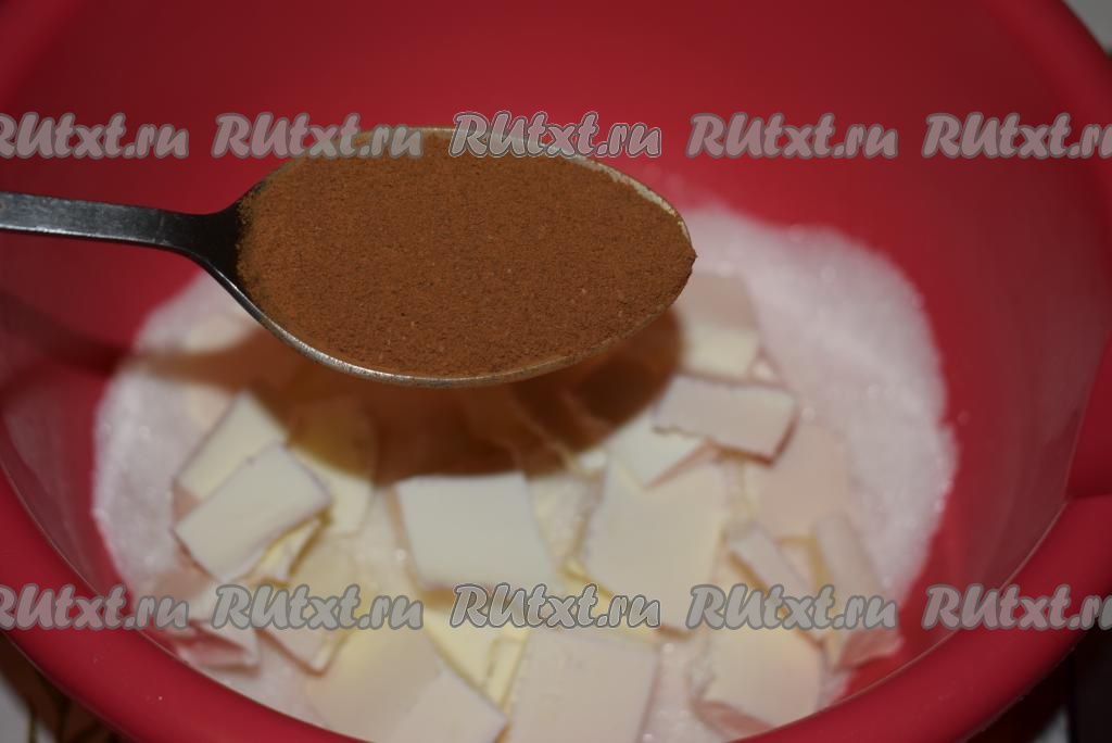 Сливочное масло нарезаем на кусочки и выкладываем в миску, добавляем сахар, соль и корицу.