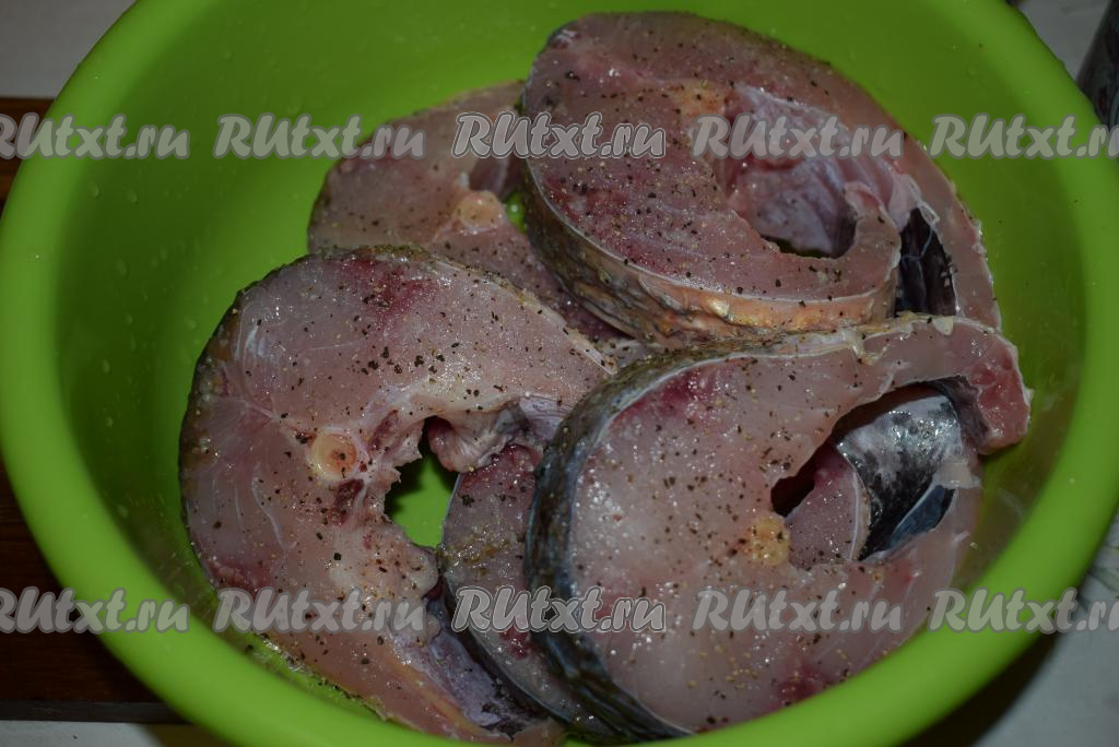 Подготовленные стейки сложим в глубокую миску, посолим и поперчим рыбу.