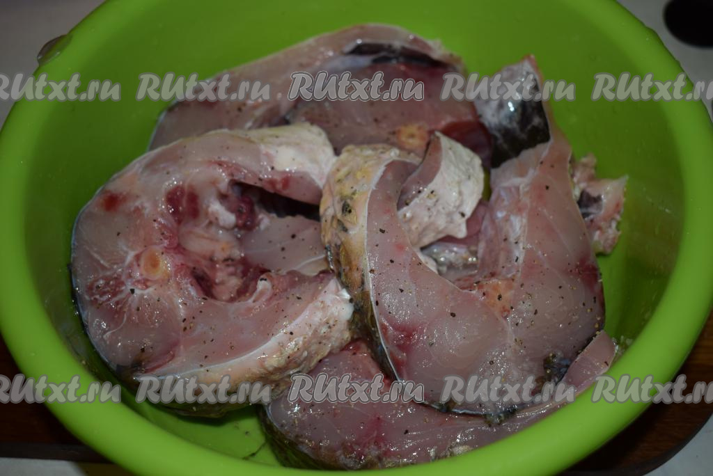 Так как кусочки рыбы довольно крупные, то солить нужно так, чтобы рыбка хорошо просолилась и в середине, поэтому руками тщательно втираем соль в кусочки белого амура. Оставляем просолиться не менее чем на 1-2 часа.