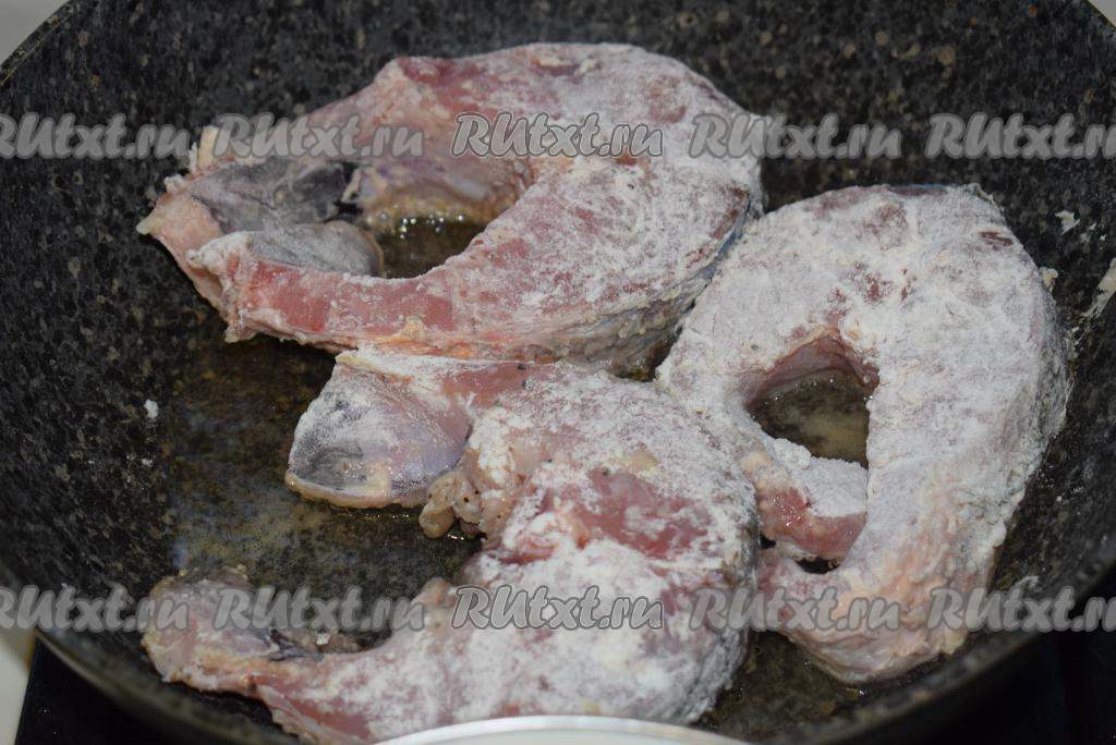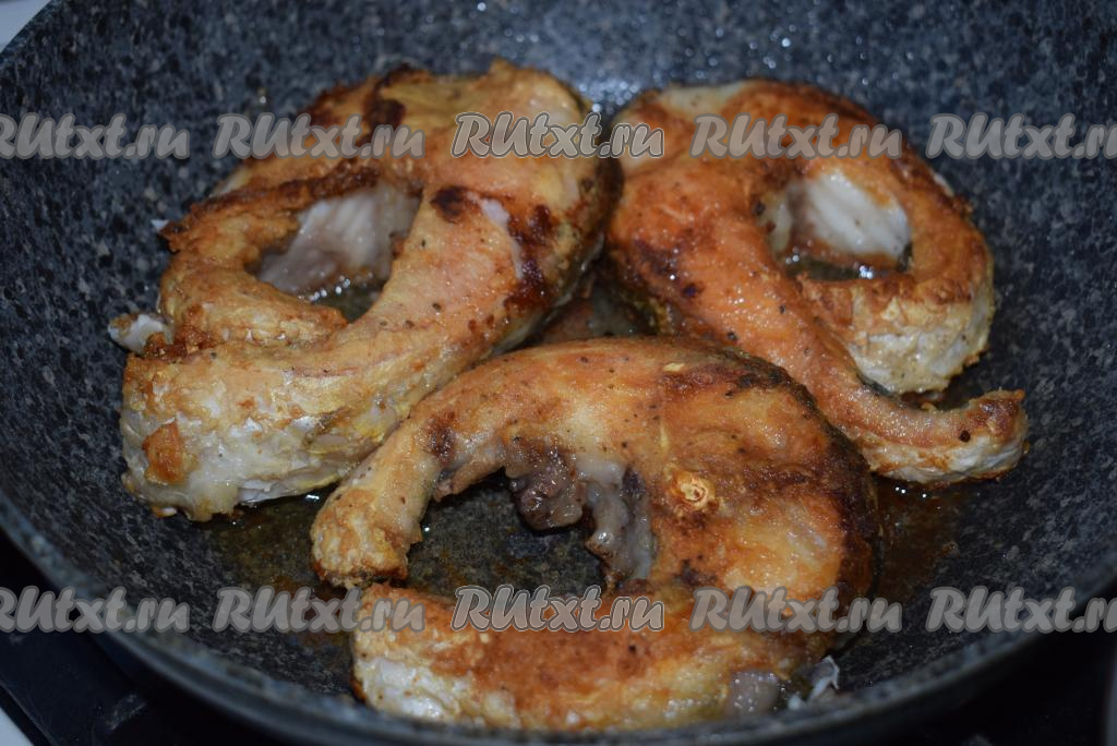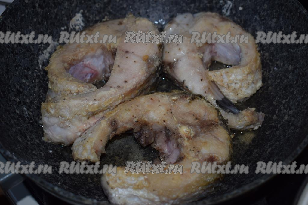 Далее накрываем сковороду крышкой и делаем огонь средним. Обжариваем стейки белого амура с двух сторон, периодически переворачивая кусочки, еще по 10-15 минут с каждой стороны (до образования на рыбе румяной аппетитной корочки). Кусочки крупного размера готовятся не быстро, поэтому торопиться не стоит и игнорировать накрытие сковороды крышкой тоже, так как именно при таком способе жарки стейки белого амура получатся сочными внутри, с хрустящей и аппетитной корочкой снаружи.