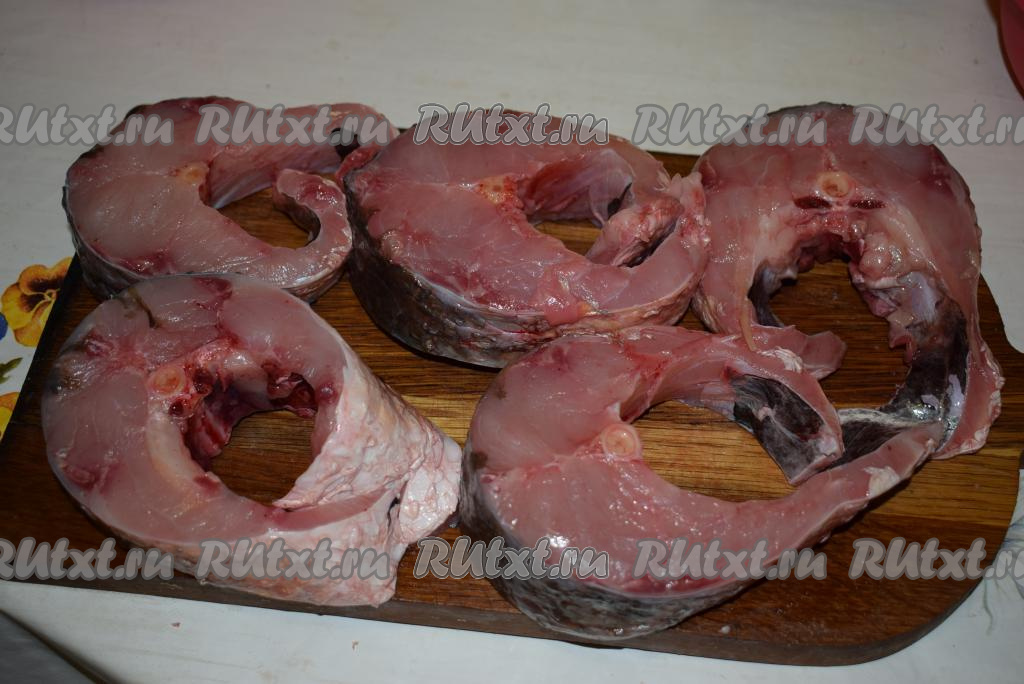 Для начала очистим рыбу от чешуи, удалим внутренности и тщательно промоем проточной водой. Отрежем голову и хвост. Их мы жарить не будем, а уберем в морозилку, в дальнейшем можем эти части использовать для приготовления супа. Затем нарежем рыбу на порционные кусочки (стейки) и обсушим бумажными полотенцами.