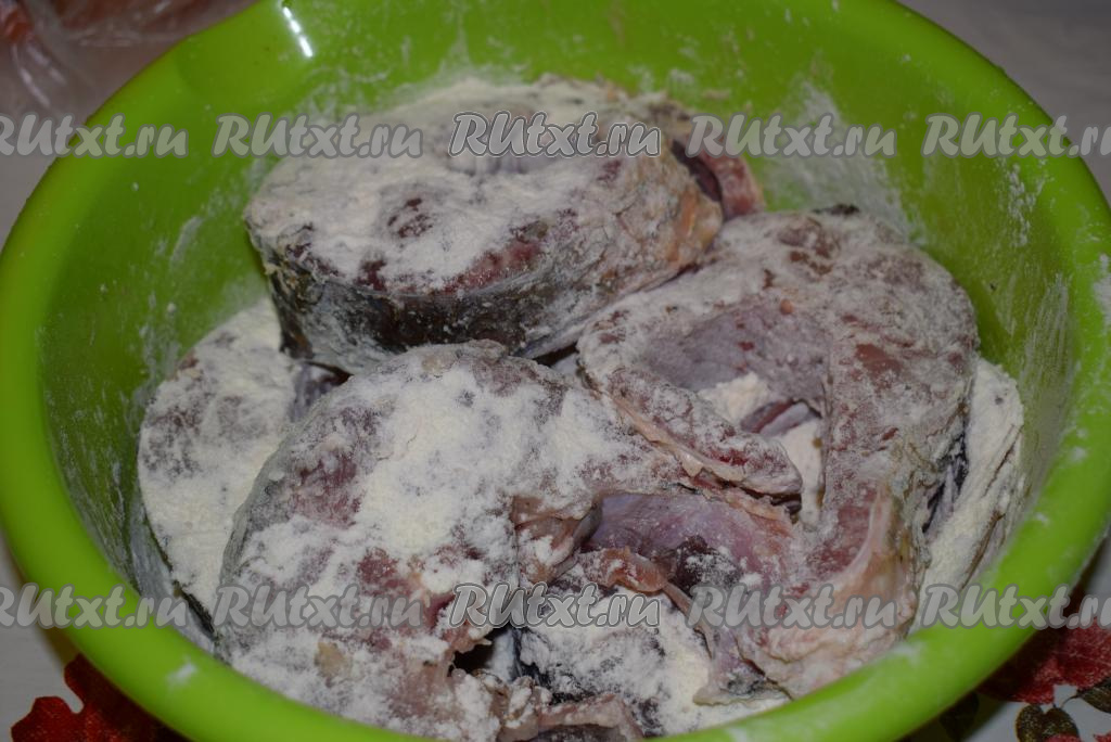 Далее сливаем образовавшуюся жидкость. Кусочки белого амура обваливаем в муке со всех сторон.