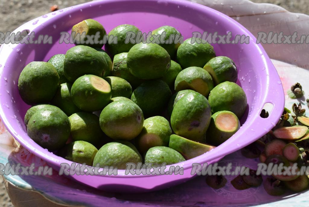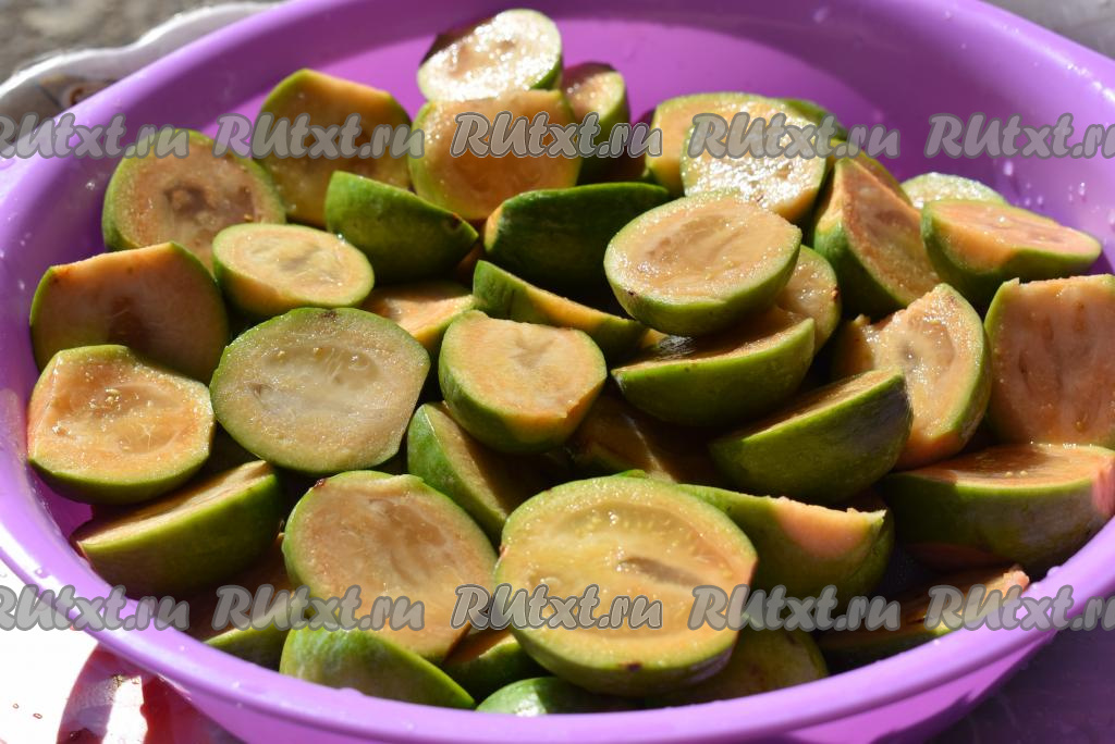 Обрезать у фейхоа сухие кончики и, если есть, порченые или битые места. Для этой заготовки нам потребуется 1 килограмм подготовленной фейхоа.