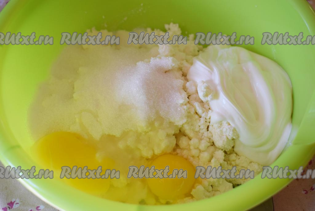 Далее приготовим начинку для нашего сочного творожного "торфяного" пирога, для этого в глубокую миску кладем творог, сахар, крахмал, сметану и яйца.