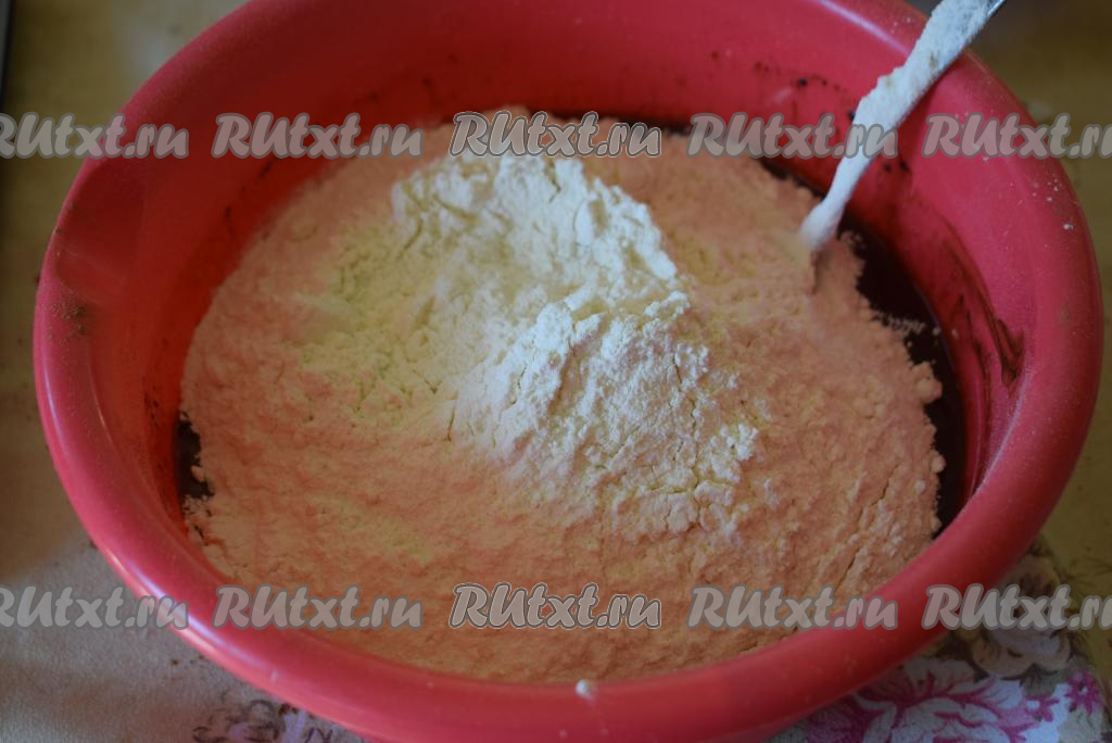 Перемешиваем масляную смесь с какао до однородности, затем всыпаем муку и перемешиваем тесто сначала ложкой, а затем руками.