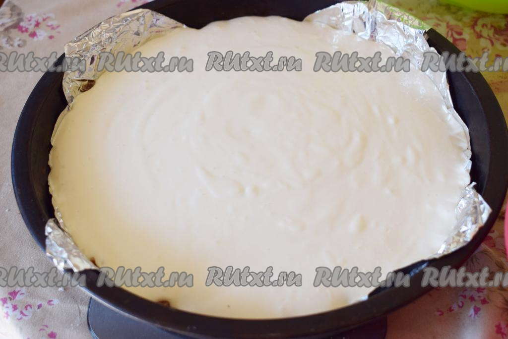 Дно формы диаметром 26 см застилаем пергаментом или фольгой (застилать дно формы надо обязательно, для того чтобы в дальнейшем можно было аккуратно извлечь пирог из формы). Такой пирог можно выпекать и в разъемной форме - это тоже очень удобно. На дно застеленной формы насыпаем чуть больше половины нашего теста.