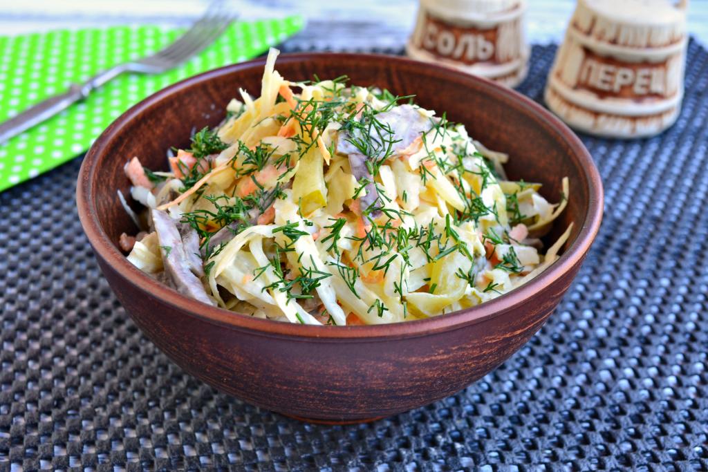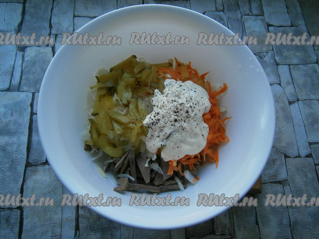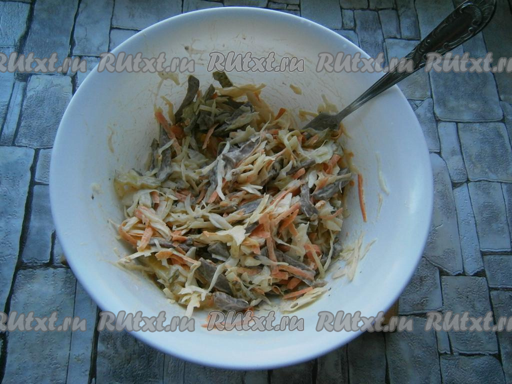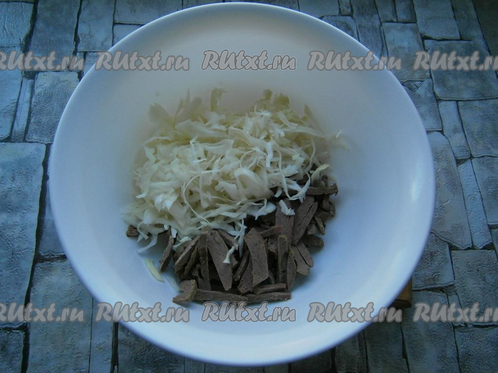 Свиное сердце отварить в подсоленной воде в течение 1,5 часов, остудить и нарезать брусочками. Добавить тонко нашинкованную капусту.