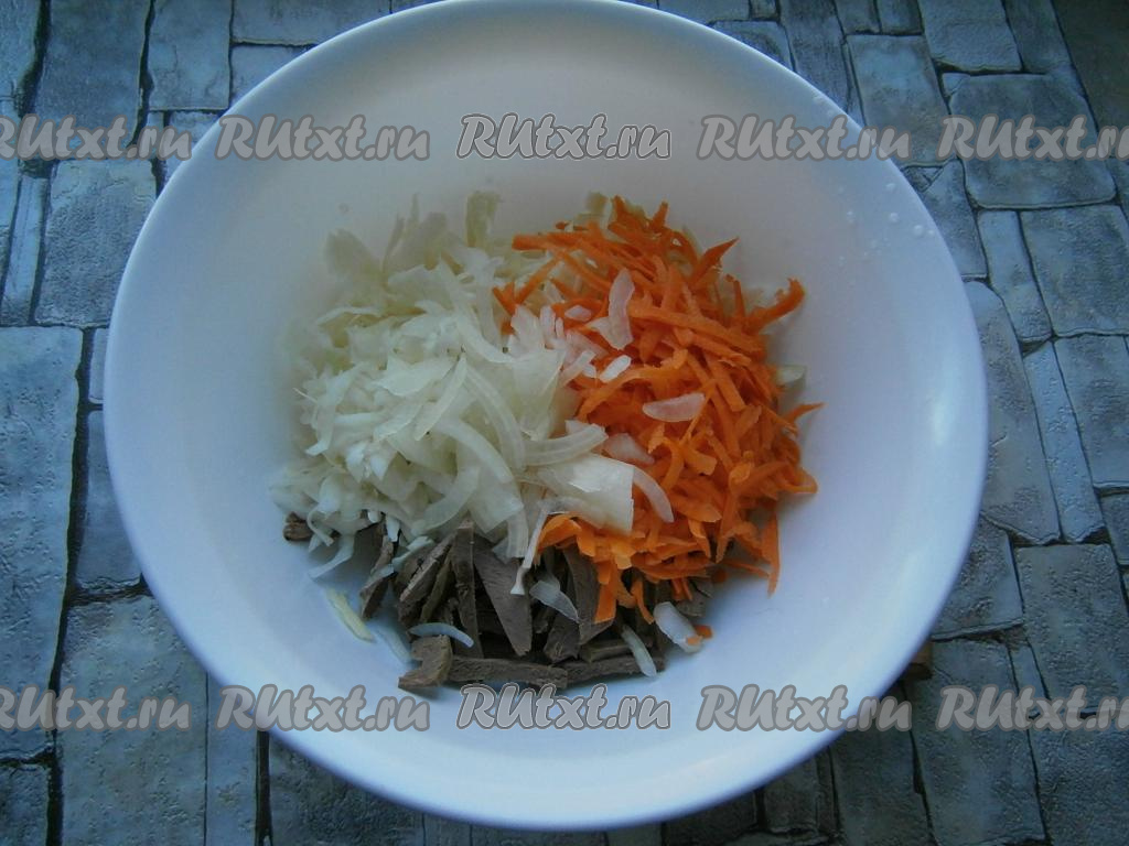 К капусте и сердцу добавить очищенный репчатый лук, нарезанный тонкими четвертинами, и очищенную морковь, натертую на крупной терке.