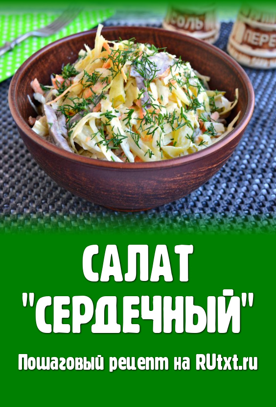 Салат "Сердечный" - простой и вкусный салатик, который понравится всей семье. Сердце я использовала свиное, но подойдёт и говяжье или индюшиное сердце. Салат заправляется майонезом, по желанию, можете заправить сметаной. Капусту я брала белокочанную, но можно взять и пекинскую - она сделает блюдо более нежным. Очень вкусный салат, попробуйте!