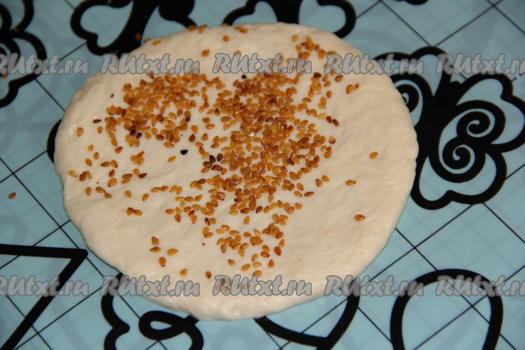 Посыпать каждую лепёшку кунжутом и вкатать его скалкой в тесто с двух сторон.