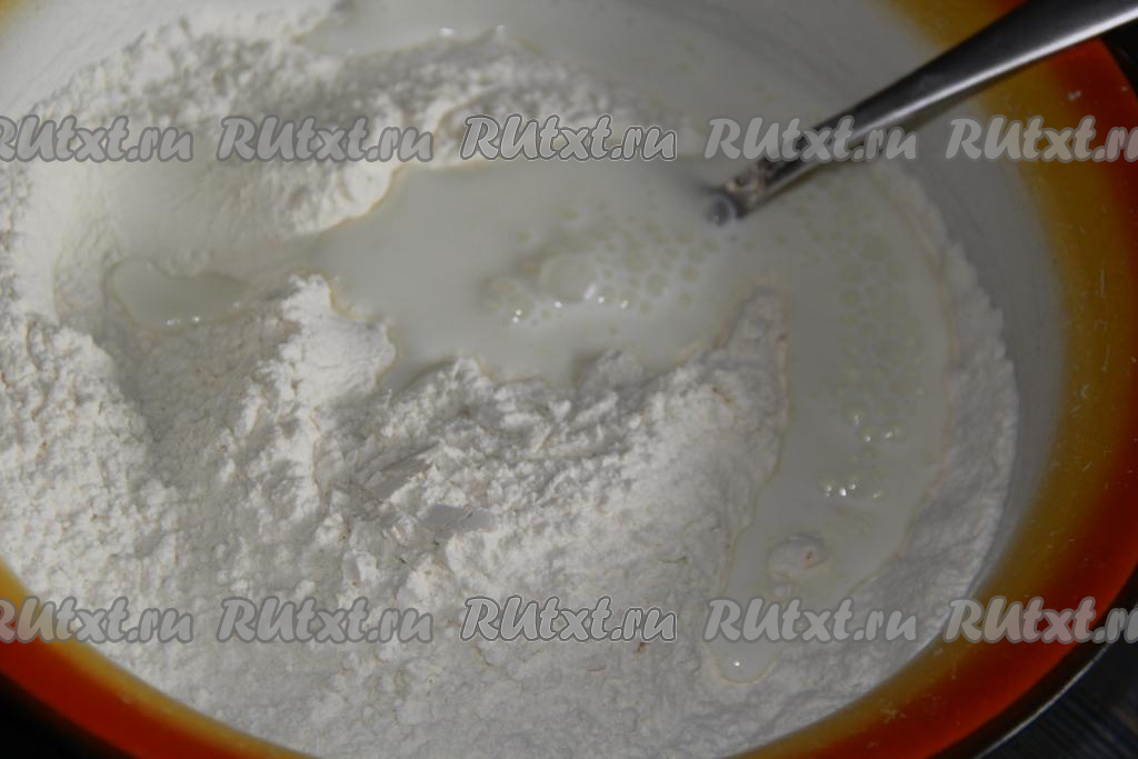 Затем влить небольшими порциями кефир и замесить нежное, не липнущее тесто.