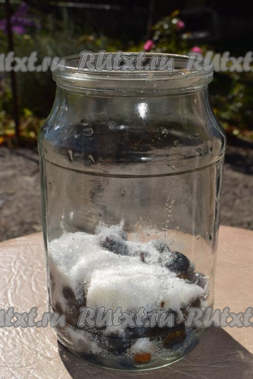 В банку с тёрном добавляем сахар.