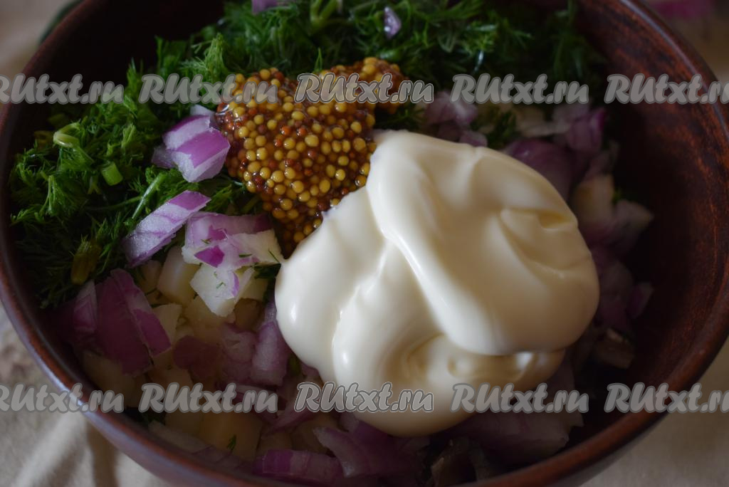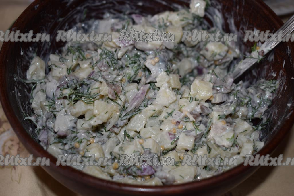 Смешать салат с майонезом и горчицей. Попробовать на вкус, если необходимо, то подсолить.