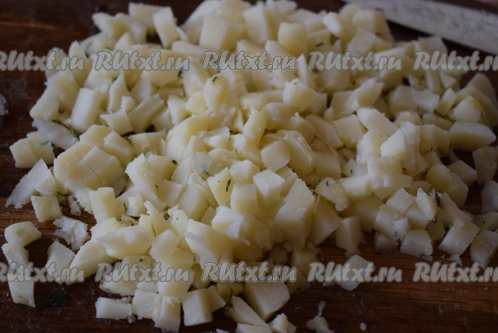 Картофель отварить в мундире до готовности. Охладить, очистить от кожуры и нарезать кубиками.