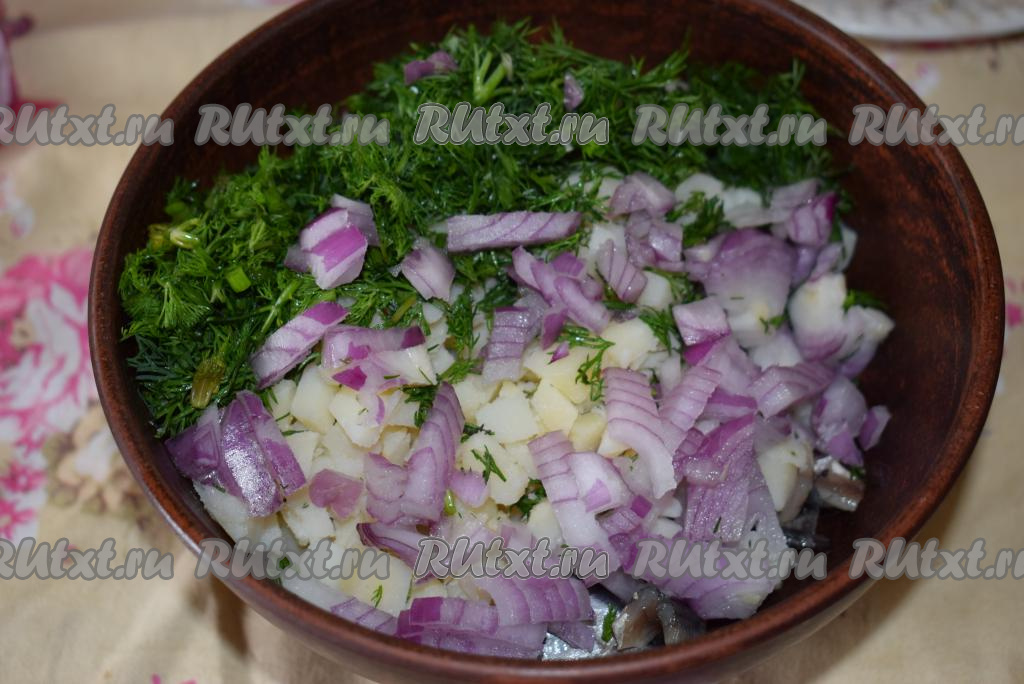В миску добавить майонез, горчицу и свежемолотый перец. Салат из хамсы не солить, пока он не заправлен, так как хамса может быть солоноватой!