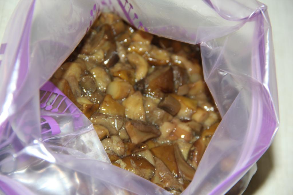 Затем тёплые грибочки разложить по пакетам. Лучше сделать порционные пакеты (то есть выложить в пакет столько вареных грибов, сколько вам понадобится для приготовления того или иного блюда). Закрыть пакеты с отварными грибами (для того чтобы пакеты занимали меньше места, я аккуратно разравниваю грибочки, чтобы они лежали в пакете ровным слоем) и отправить их на хранение в морозилку. Отварные замороженные грибы могут храниться в морозильной камере до нового грибного сезона. Заморозьте лесные грибы и они прекрасно разнообразят меню в холодные зимние дни!