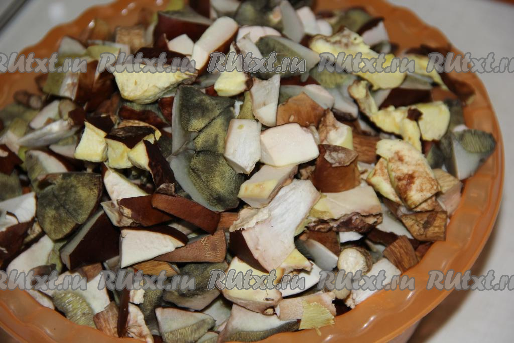 Лесные грибы перебрать, удалить грязь и листву. Нарезать грибы. Я отварные грибы использую для приготовления вареников и пирогов, поэтому нарезаю не крупно.