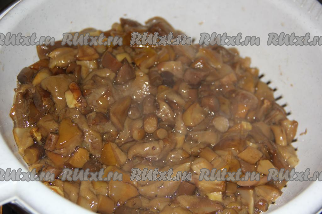Затем откинуть грибы на дуршлаг и дать хорошо стечь воде. Немного остудить грибы.