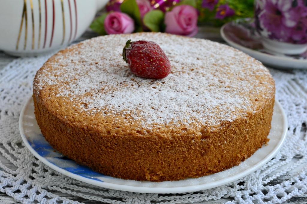 Пышный, нежный, ровненький и очень вкусный самый простой бисквит для торта оставить в форме минут на 10-15, после чего, аккуратно проведя по краю ножом, извлечь его и остудить полностью на решетке. Далее бисквит можно разрезать и прослоить любым кремом. Также бисквит можно просто подать к чаю, посыпав сверху сахарной пудрой и украсив ягодами.