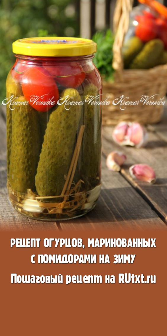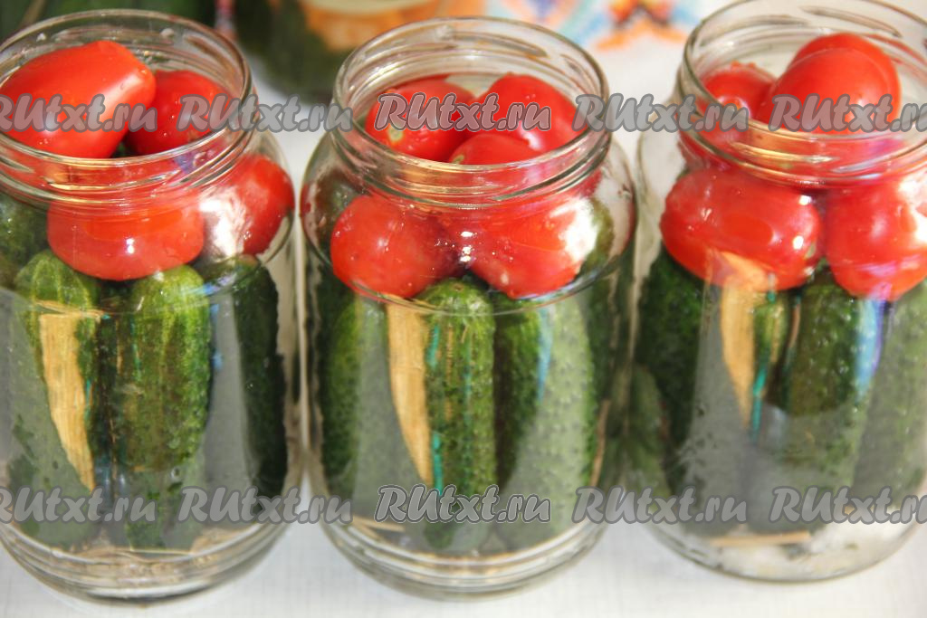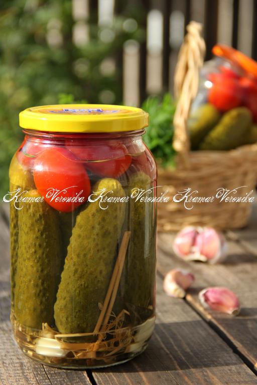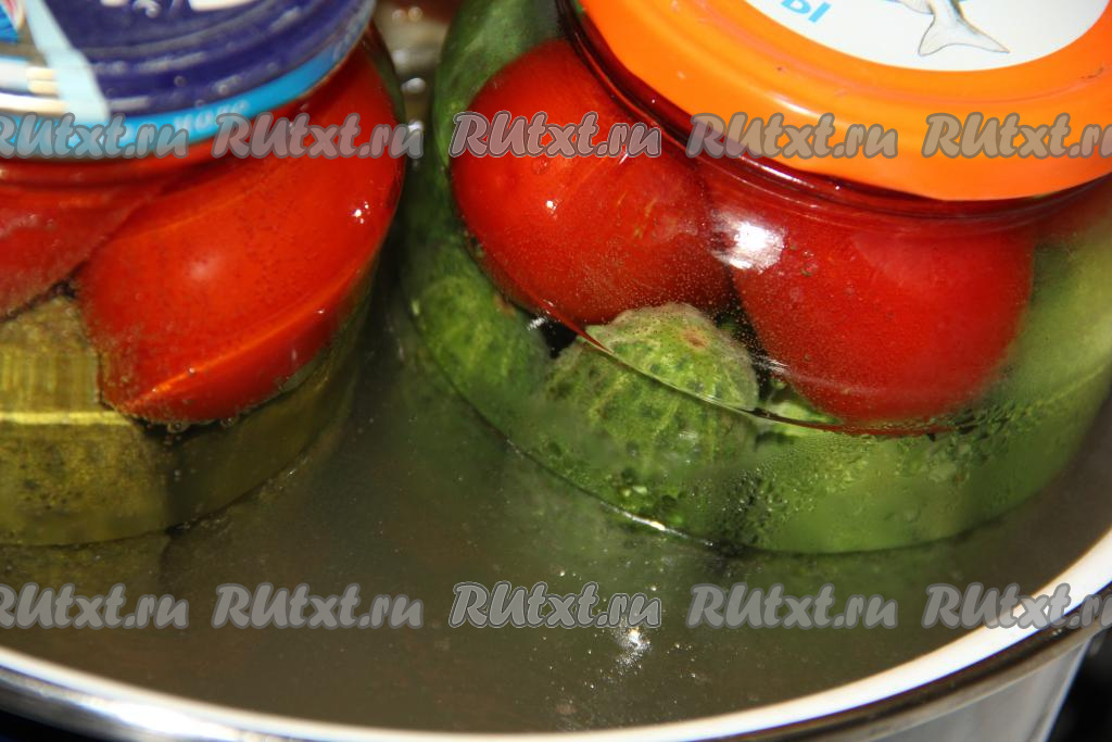 Аккуратно достать банки из горячей кастрюли и закрутить крышками. Перевернуть банки, укутать в одеяло и оставить до полного остывания. Вот такое красивое и аппетитное ассорти получилось. Надеюсь, рецепт приготовления огурцов, маринованных с помидорами, вам понравится. Зимой такая заготовка станет наивкуснейшим дополнением ко многим блюдам.