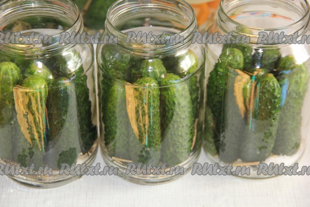 Огурчики лучше замочить на пару часов (можно на ночь) в холодной воде. Затем хорошо вымыть огурцы. Плотно утрамбовать огурчики в банку. Огурчики желательно выбирать среднего размера.