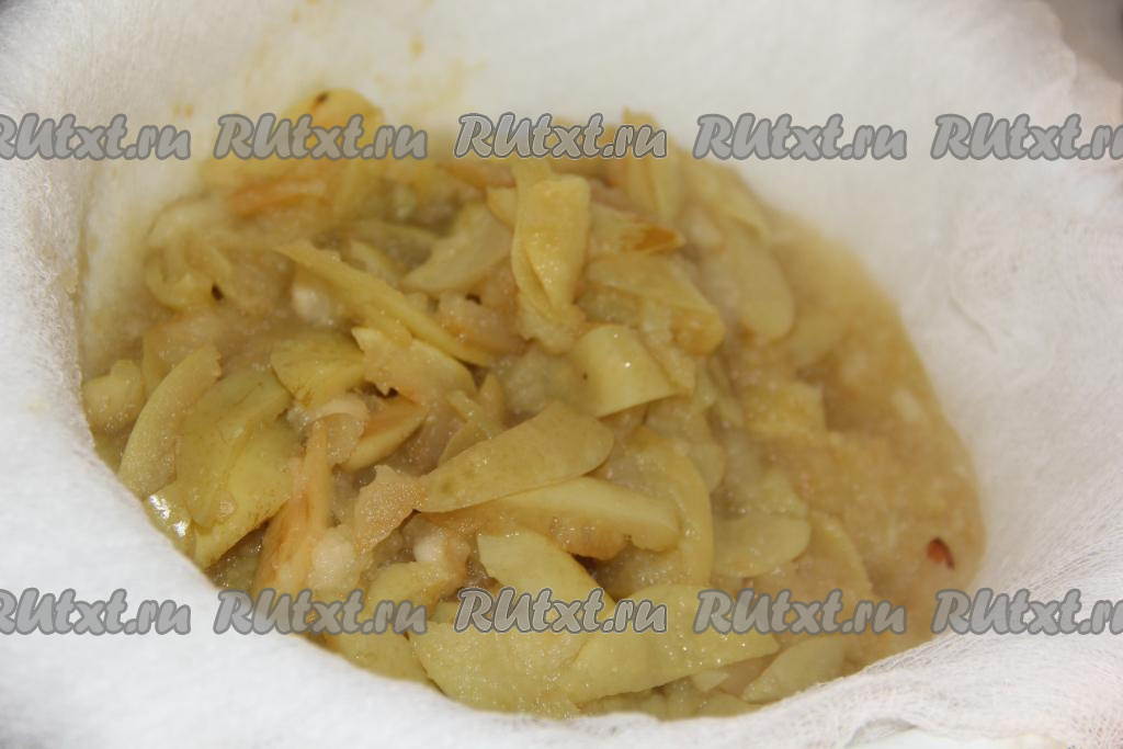 Дуршлаг выстелить несколькими слоями марли. Откинуть яблоки на дуршлаг. Нам будет нужна жидкость от яблок, мякоть и жмых мы выкинем. Дать хорошо стечь всей воде.