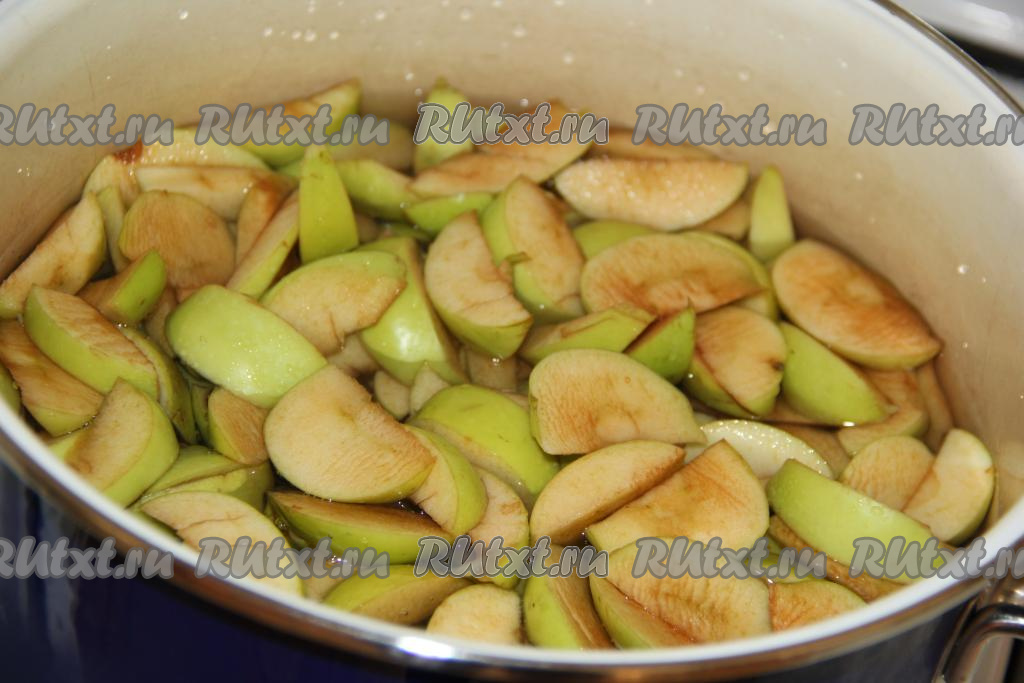 В результате должен получиться 1 килограмм нарезанных яблок, выложить их в кастрюлю и залить холодной водой так, чтобы вода чуть накрыла яблоки.