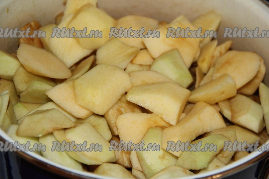 Яблоки вымыть, очистить от кожуры и семечек. Должно получиться 2,5 килограмма яблок, нарезать их на небольшие дольки, выложить в кастрюлю, добавить воду.