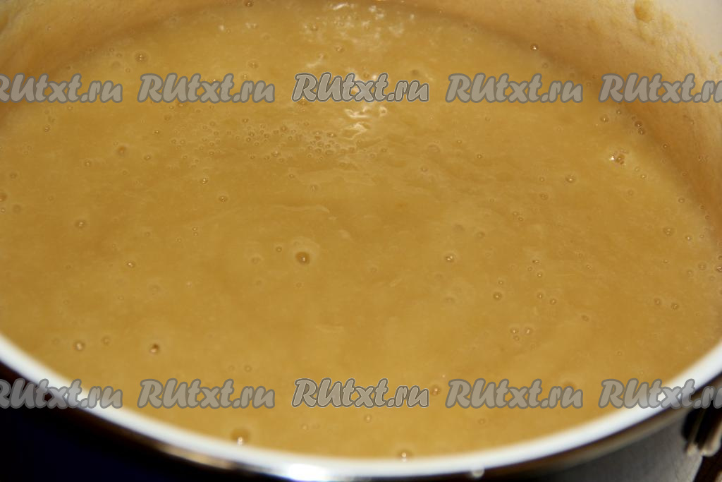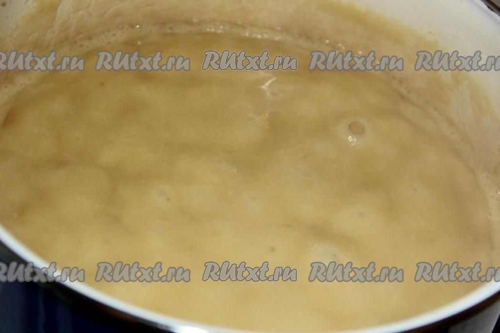 Как только яблоки станут мягкими, снять кастрюлю с огня и пробить яблоки в пюре с помощью погружного блендера. Яблочное пюре должно стать однородным, без комочков.