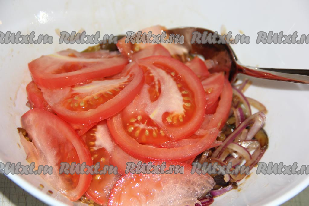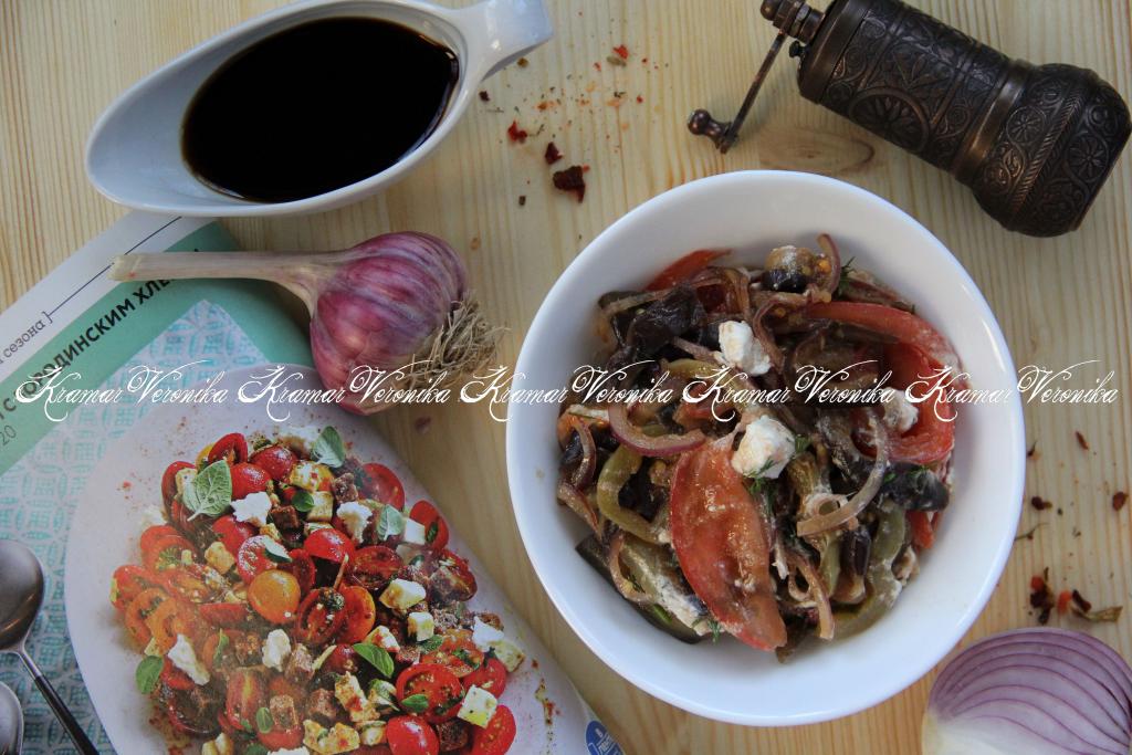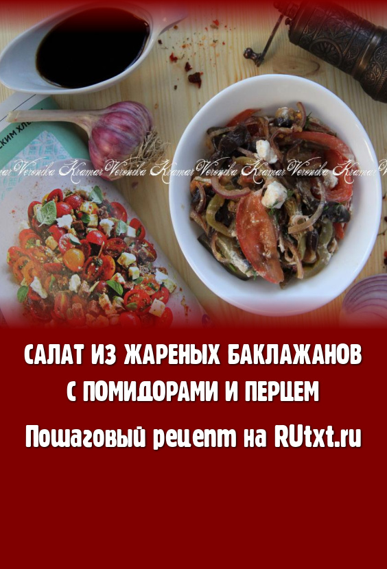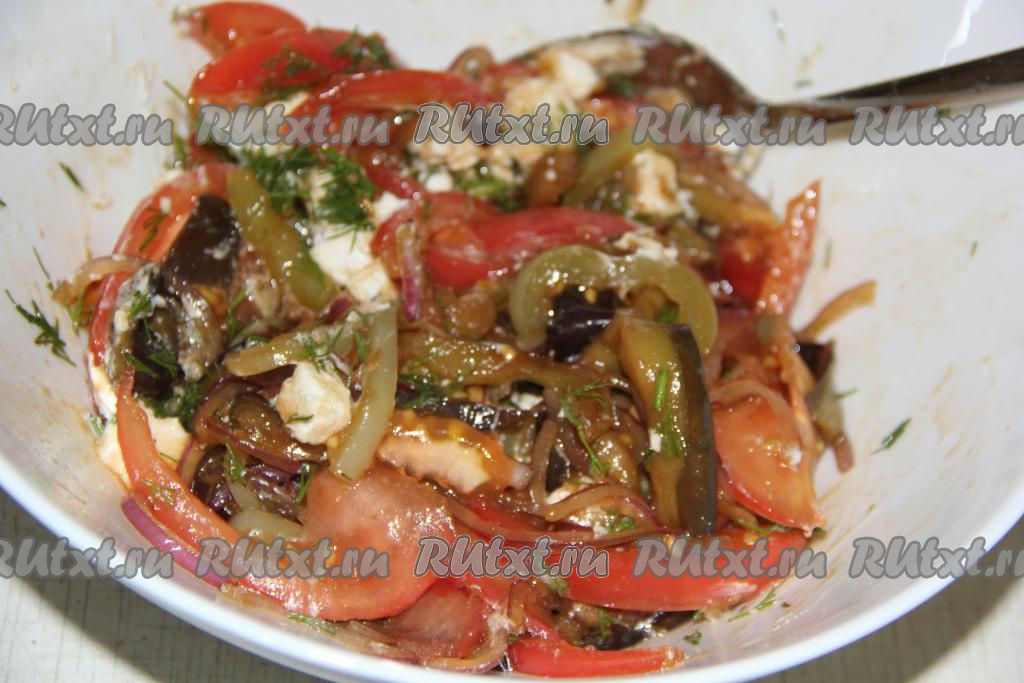 Вот такой простой и очень вкусненький салат из жареных баклажанов с помидорами и перцем получился.