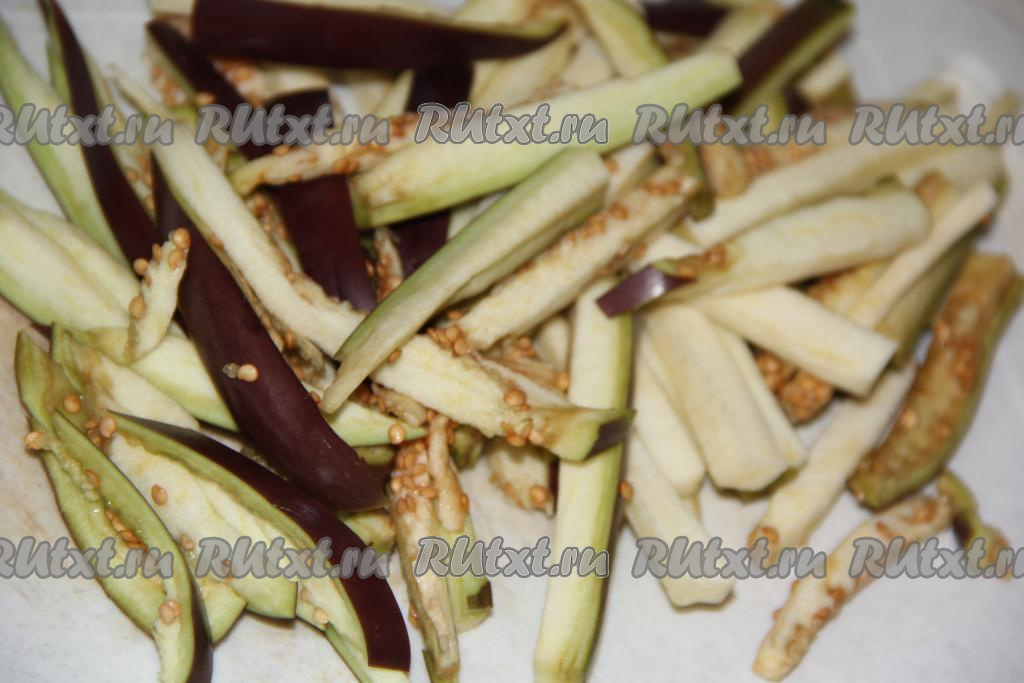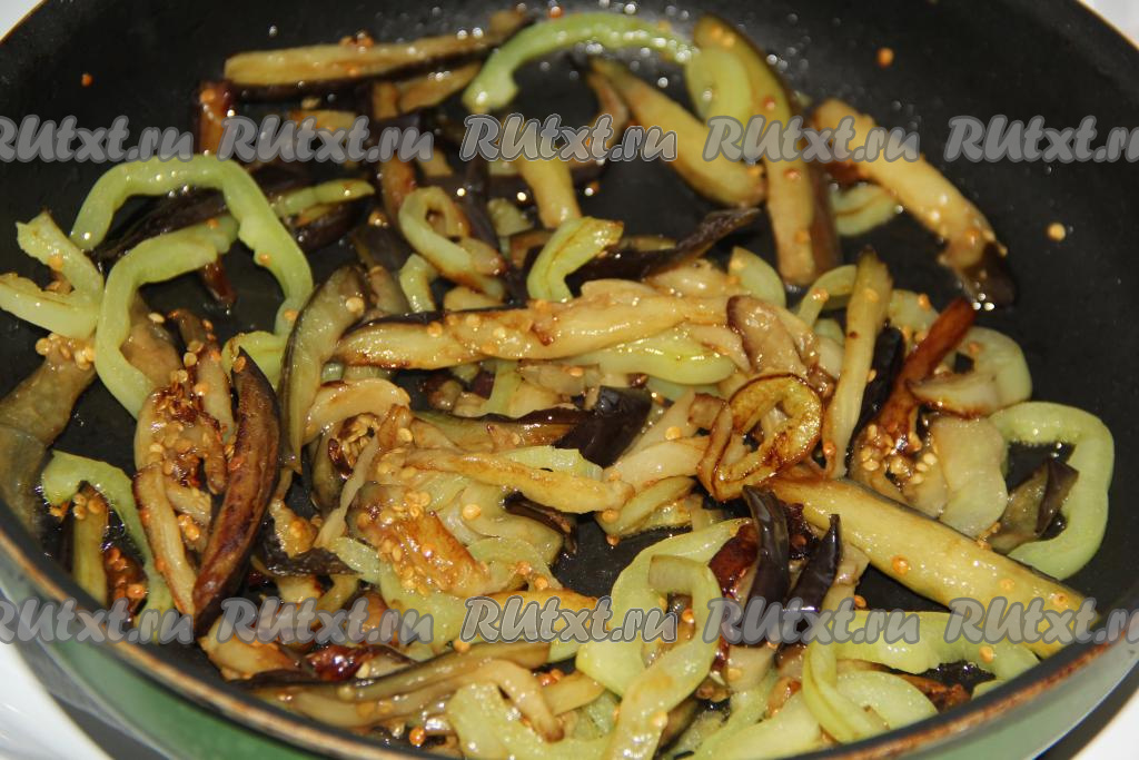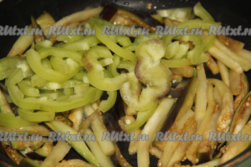 Обжарить баклажаны с перцем в течение 10 минут, перемешивая. Баклажанчики обмякнут, а перчик останется слегка хрустящим.