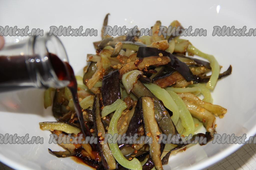 Выложить жареные баклажаны с перцем в глубокий салатник. Добавить в тёплые овощи соевый соус и хорошо перемешать салат.