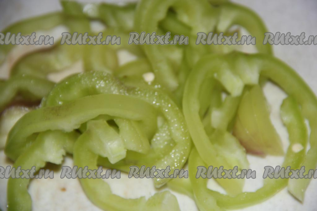 Болгарский перец вымыть и, удалив плодоножку и семена, нарезать длинными полосками.