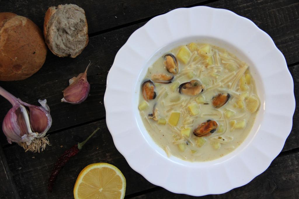Добавить в горячий бульон мидии и картофель, довести суп до кипения и варить минут 10 на среднем огне.