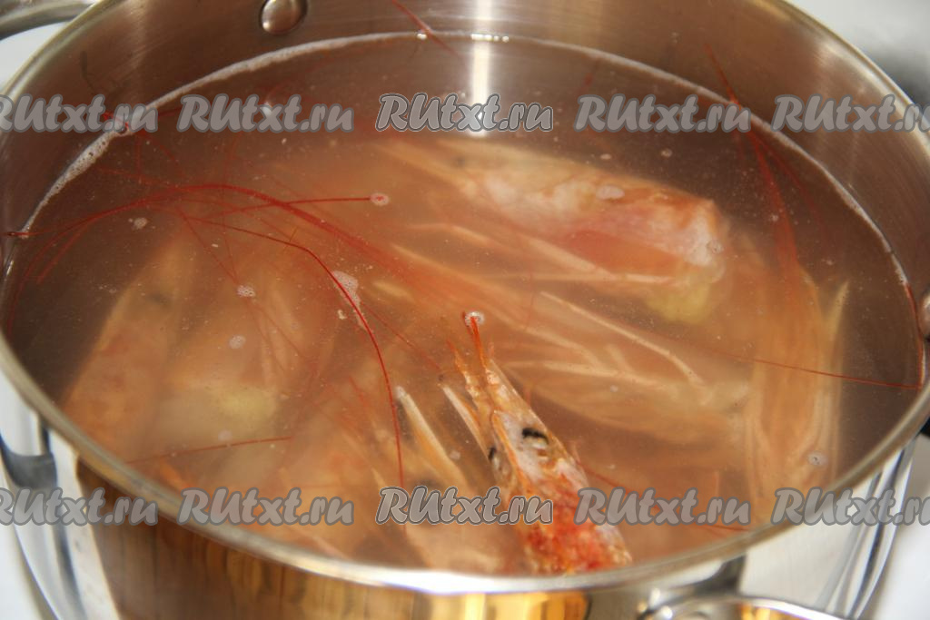 После закипания убрать пену, убавить огонь и варить 15 минут. Готовый бульон процедить. Если вы готовите с головами лангустинов - их можно выкинуть, если с креветками - их нужно очистить и отставить в сторону.