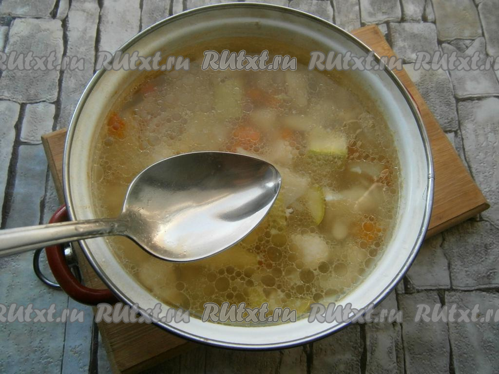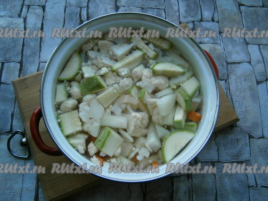 Сюда же добавить и нарезанный кусочками кабачок (молодой кабачок можно готовить, не очищая от кожуры и семечек). Залить овощи холодной водой.