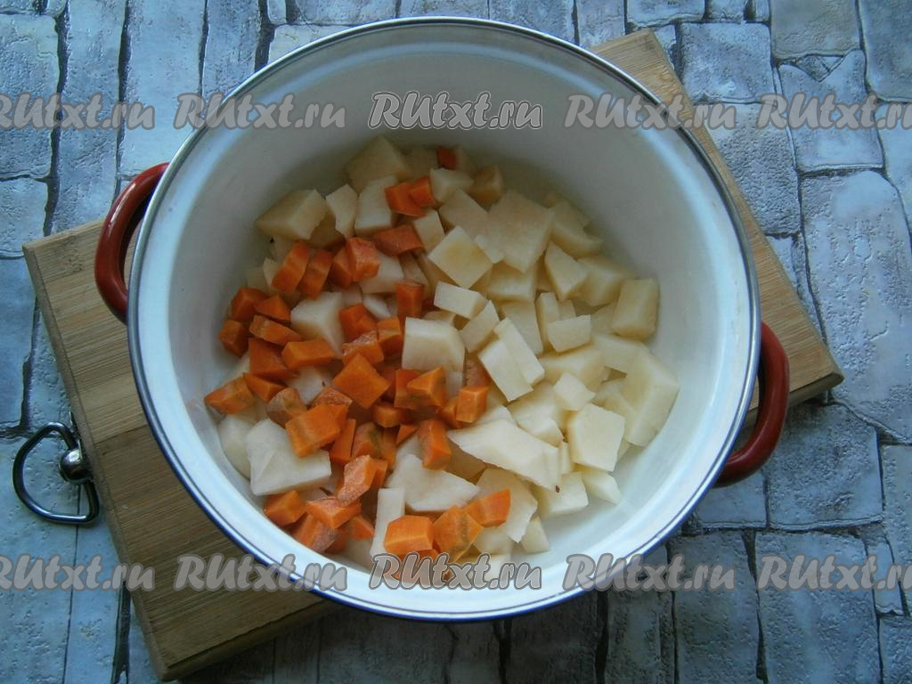 Картофель и морковь очистить, нарезать в кастрюлю небольшими кубиками.