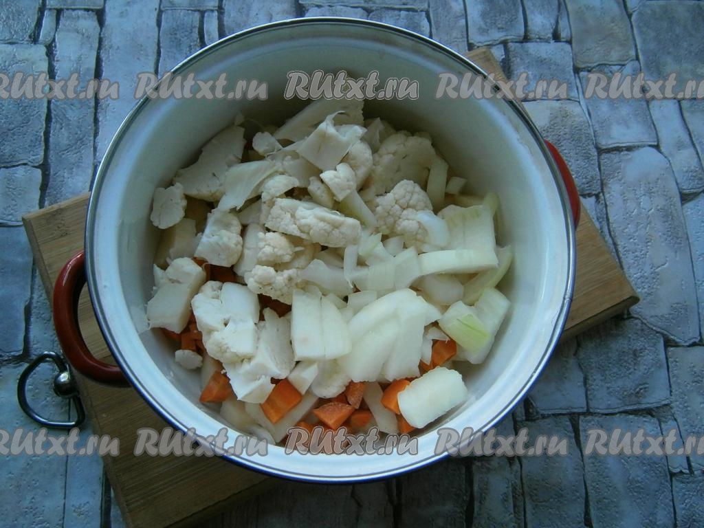 Добавить очищенную и нарезанную кусочками луковицу и нарезанные соцветия цветной капусты.
