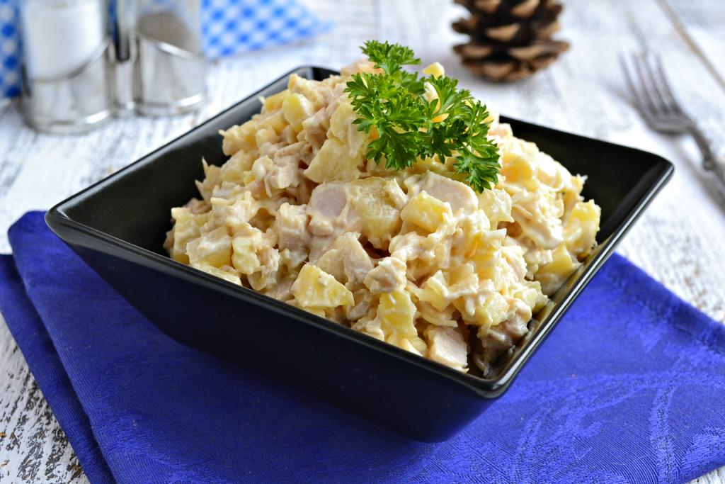 Выложить очень вкусный салат, приготовленный с курицей, ананасами и картошкой, в салатник, украсить и подать к столу.