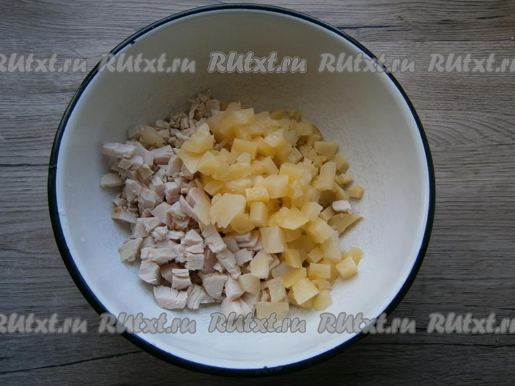 Консервированные ананасы, нарезанные кубиками, выложить к курице и картошке.