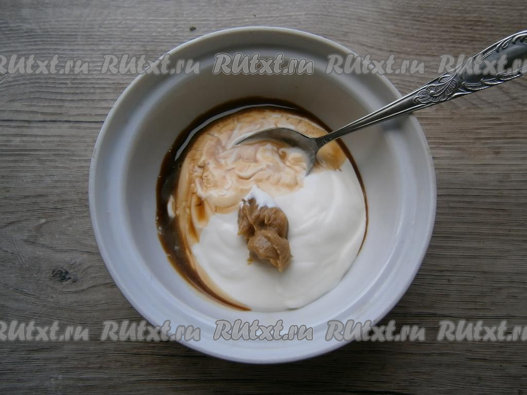Для приготовления заправки в сметану влить соевый соус и добавить горчицу, тщательно перемешать.